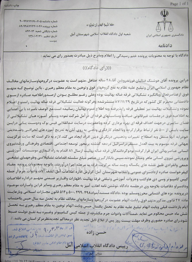 خبرگزاری هرانا - هوشنگ فنائیان شهروند بهایی ساکن آمل که در اسفند ماه سال گذشته بازداشت شده بود طبق حکم ریاست دادگاه انقلاب آمل به ۴ سال و نیم حبس تعزیری محکوم شد.