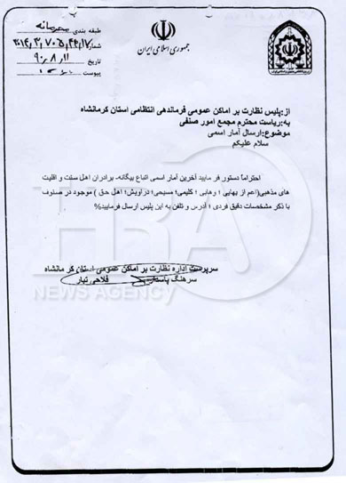 خبرگزاری هرانا – پلیس ناظر بر اماکن عمومی فرماندهی انتظامی استان کرمانشاه در نامهای رسمی به ریاست مجمع صنفی این استان خواست در شناسایی اقلییتهای مذهبی موجود در صنوف این استان و معرفی ایشان به پلیس همکاری کند.بنا به اطلاع گزارشگران هرانا از کرمانشاه، این نامه که در طبقه بندی محرمانه به تاریخ ۱۱ آبان ماه به مجمع صنفی استان کرمانشاه ارسال شده است از ریاست این مجمع به صراحت خواسته شده است در شناسایی اتباع بیگانه، اهل سنت و سایر اقلییتهای مذهبی از جمله بهائیان، وهابیها، کلیمیان، مسیحیان، دراویش و پیروان اهل حق و ارسال اسامی و مشخصات از جمله آدرس و تلفن محل کسب ایشان به پلیس ناظر بر اماکن این استان همکاری نماید.